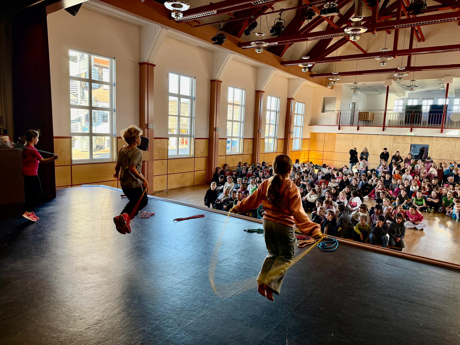 Unter dem Motto „Fit mit jedem Sprung“ übten die Kinder bereits seit Wochen im Sportunterricht. Die Stimmung war ausgelassen, das Publikum – bestehend aus Mitschülerinnen und Mitschülern der Klassen 1-4 und Lehrkräften – feuerte die Teilnehmenden lautstark an.